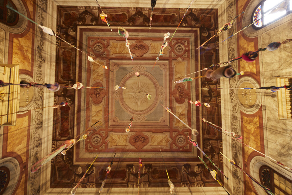 We enter a deconsecrated church filled with the smell of wax and incense. The light, sad and faded, converges in the center. The wooden floor and the semi-square plan make it similar to a theater stall without seats. The space is empty, without benches. The shape of the balconies recalls theater boxes but, depending on how we position ourselves, we could imagine being in an empty auditorium or on a stage with the wings on the sides. Sinfonia is the title of the installation made up of textile sculptures descending from the ceiling. The work was created by the Brazilian artist Sonia Gomes together with the inmates. It is indeed a spectacle: 35 fabrics – made of cotton, silk or acrylic, poor or precious, single-colored or multi-colored – are wrapped around themselves like lianas or thick colored ropes. The fabrics that have been chosen were once clothes, or anything else, that belonged to someone because Gomes wants them lived-in and imbued with life. Inside the church, a melody, composed by the Brazilian guitarist Plinio Fernandez, spreads, interrupting itself at times; the rhythm accompanies the spaces delimited by the textile sculptures. The church is dedicated to Mary Magdalene, who sinned but was forgiven; we read her story, a symbol of the possibility of redemption, inside two rose windows in the center of two opposing walls. As our guides tell us, the sculptures that float between the two rose windows ideally connect the punishment with the possibility of living another life. The peculiarity of this place favors the dual position of spectators and actors. The waving works never cease to make us actors of the fantasies they trigger; probably immediately after having been spectators , amazed, and perhaps enchanted. The inmates never wanted to come here; I think this empty and dimly lit place was disturbing. Now it’s different: one of the two inmates tells us that to her, those twisted fabrics swinging from the ceiling, recall her tense body with her head pointing downwards, beyond the bars, when she tries to look out. The other inmate tells us that some of their companions really like these textile sculptures because they invite you to look up: they are cocoons ready to turn into butterflies; a bit like them.